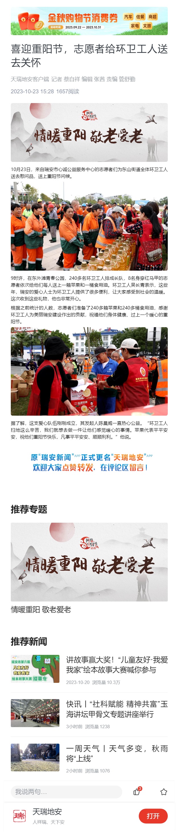 喜迎重阳节,志愿者给环卫工人送去关怀(瑞安市心诚公益服务中心)