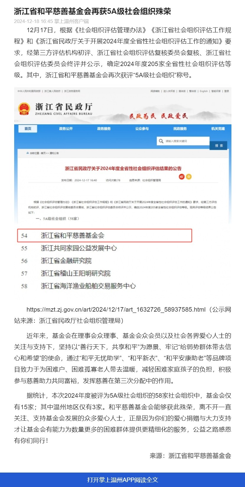 浙江省和平慈善基金会再获5A级社会组织殊荣